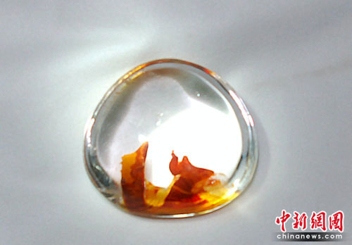 全國30多個單位的參展商帶來的珍品將整個展館擺放的滿滿當當。當記者來到水晶展柜前時,來自西安的張老板拿出了自己收藏了十多年的天然水晶“王者之鳳”。據(jù)他介紹,天然水晶是水受到擠壓后形成冰膜,吸取地下的氧化亞鐵和鎂元素后形成的。“王者之鳳”原產(chǎn)地為巴西,圖為一只頭戴王冠的鳳凰昂首挺胸站在山頂上,鳳尾向下飄垂,紅黃兩色代表著吉祥喜慶,極其罕見。