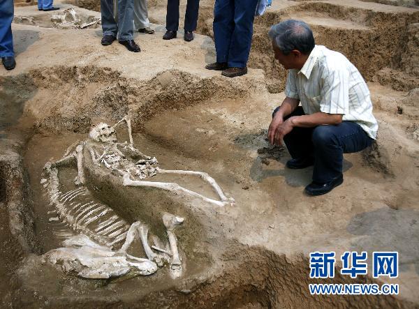 這是6月6日拍攝的洛陽市林校西周洛邑祭祀遺址的人馬組合坑。當日,河南洛陽市文物局組織專家對洛陽市林校西周洛邑祭祀遺址考古發(fā)現(xiàn)進行研討并向媒體發(fā)布了發(fā)掘成果。這處遺址西距瀍河約1公里,西北距北窯西周墓地及西周鑄銅遺址約4公里,總發(fā)掘面積為945平方米,于2009年2月開始發(fā)掘?脊湃藛T在洛陽市林校工地共發(fā)現(xiàn)西周灰坑59座、流水溝1條、墓葬14座以及唐代灰坑42座,其中31座西周祭祀坑的發(fā)現(xiàn)是本次發(fā)掘的重要收獲,為尋找西周洛邑城址提供了又一重要線索。新華社發(fā)(張曉理 攝)