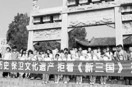 5月29日上午8點,南陽數(shù)百網友還在臥龍崗山門前的“千古人龍”牌坊下,拉起條幅,30名小學生齊聲誦讀前《出師表》,游人與市民簽名聲援。活動的最后,幾名網友還抬出一臺電視機當場砸毀,以示對新《三國》的抗議。