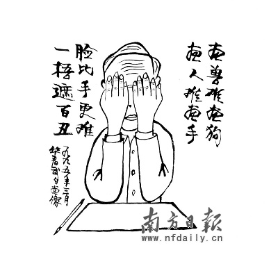廖冰兄有一幅著名的漫畫《自嘲》,辛辣刻畫了一些人在“甕破”之后仍然瑟瑟發(fā)抖的形象。華君武也有一幅《自畫像》,但畫中人卻沒有露出面孔,華君武這樣風(fēng)趣地自嘲說:“我是畫不了素描的嘛,當(dāng)然也就畫不了自畫像。怎么辦?只好畫了一個人,雙手緊緊地把臉捂住。”