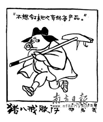 “文革”結(jié)束后,華君武出任全國美協(xié)副主席。這個時期華君武特別喜歡畫豬八戒。他認(rèn)為人性中的弱點,豬八戒幾乎大都具備。上世紀(jì)80年代假冒偽劣產(chǎn)品出現(xiàn),他揮筆創(chuàng)作《豬八戒敗陣》,畫中的八戒之所以敗陣,就因沒想到連他用的釘耙也是假冒偽劣產(chǎn)品,因而打了敗仗。因為這一系列諷刺作品,有人形容華君武的漫畫是“刀刀見血,入木三分”。