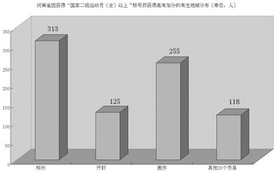 進(jìn)一步統(tǒng)計(jì)還可發(fā)現(xiàn),廣東省經(jīng)濟(jì)最發(fā)達(dá)的3個(gè)城市:廣州、深圳和珠海,體育尖子生共有725人獲得加分,占該項(xiàng)目總?cè)藬?shù)的近3/4,但三市考生人數(shù)只占廣東考生總數(shù)的1/6弱。