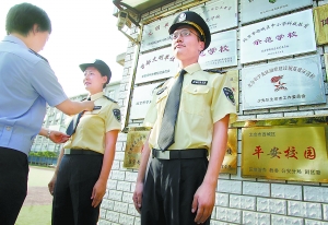 昨天(25日),北京市首批校園安全護(hù)衛(wèi)大隊的175名隊員被分配到了原西城區(qū)49所學(xué)校的58個校址。開學(xué)后,這些身著黃色標(biāo)準(zhǔn)制服,經(jīng)過半個月魔鬼訓(xùn)練,學(xué)習(xí)了格斗和急救技能的護(hù)衛(wèi)隊員將擔(dān)負(fù)起護(hù)衛(wèi)校園安全的重任。