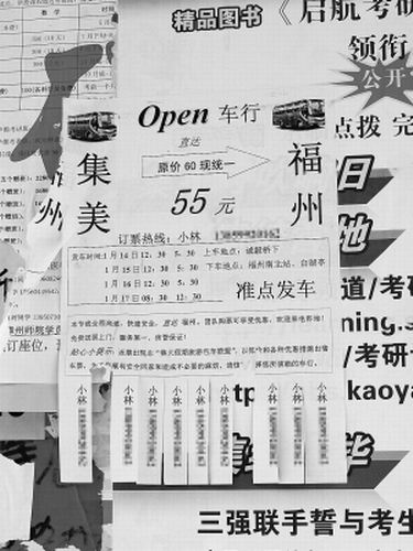 昨日(1月15日),記者走訪廈門幾所高校發(fā)現(xiàn),在學(xué)校餐廳、宿舍樓、廣告信息欄等多處地方都貼了很多包車業(yè)務(wù)的小廣告,大部分留下的都是校內(nèi)學(xué)生的聯(lián)系電話,目的地一般是福州、三明、南平等地。記者從包車廣告上看到,每天最少有兩個車次,最多高達(dá)4個。