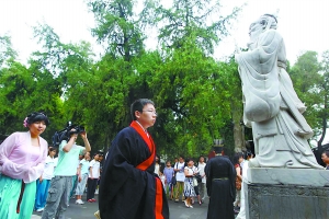 本報(bào)訊 今天上午,孔廟大成門(mén)下、孔子像前,孔廟和國(guó)子監(jiān)博物館首屆“成人傳統(tǒng)禮儀”在這里隆重舉行,包括2009年北京高考文理科狀元?jiǎng)⑼ッ贰幧訇?yáng)在內(nèi)的160多名學(xué)生參加活動(dòng),然而主辦方和媒體過(guò)分關(guān)注臺(tái)上兩位狀元的一舉一動(dòng),讓臺(tái)下的學(xué)生備受冷落。