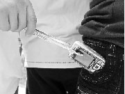 長(zhǎng)20~30厘米,狀如普通鑷子,但兩腿末端扁平,很像鴨嘴!傍喿臁苯(jīng)過(guò)小偷再加工,咬合力和摩擦力加強(qiáng)。探進(jìn)衣兜后,因尖端圓鈍,不會(huì)扎住人,很難發(fā)覺(jué)。“鴨嘴鑷”專門用來(lái)夾錢包。