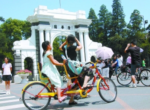 暑假來(lái)清華、北大等首都著名高校旅游的各地游客持續(xù)增加,許多是由學(xué)生與家長(zhǎng)組成的暑期名校游團(tuán)隊(duì)。清華大學(xué)每天接待游客一兩萬(wàn)人,雙休日多達(dá)幾萬(wàn)人。校方為游客增設(shè)了旅游觀光車(chē)、義務(wù)講解處及24小時(shí)自行車(chē)租賃等業(yè)務(wù),提供便利的人性化服務(wù)。 本報(bào)特約攝影 李文明 RJ136