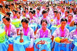 昨天的開幕式中最震撼人心是今年新排演的“七夕典禮”。在典雅的古禮樂聲中, 70名紅幡旗手、21名手持高香的巧姐、56位捧著瓜果、乞巧微型工藝品的巧女、1名德高望重的珠村父老、8名陪祭人和12名即將成年女子身著傳統(tǒng)漢服依次上場,200多名祭祀表演者佇立場內(nèi)定席如儀,場面宏大壯觀。
