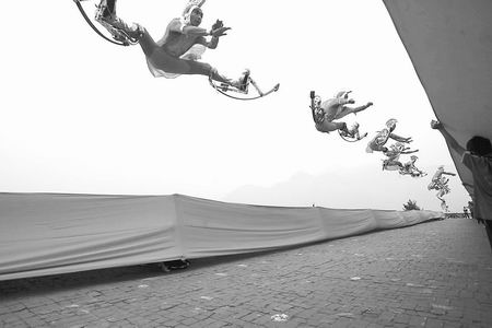 昨天,記者驅(qū)車趕到登封。雖然剛集訓(xùn)完,在塔溝武校的訓(xùn)練場(chǎng)上,220名學(xué)員仍馬不停蹄地訓(xùn)練。在一面寬50米、長(zhǎng)60米的巨幅國(guó)旗下,“彈跳小子”們身輕如燕,姿勢(shì)優(yōu)美(如圖)。
