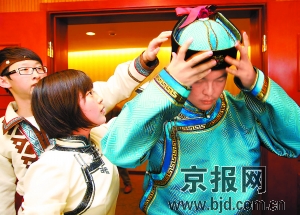 蘇·尼特,來自呼和浩特市二中高二年級。今天他代表蒙古族青少年來到了同心營。一身盛裝的他顯得特別精神,寶藍色的長袍和寶藍色的帽子,蘇·尼特說,這是蒙古族的盛裝,特意穿來為祖國母親過生日,“心情激動得沒法說,一夜都睡不著”。海南黎族的林衡帶來了黎族特色的編織袋,上面的花紋很有黎族特色,“我們黎族是一個熱情好客的民族,這一次和各民族兄弟姐妹齊聚在一起為祖國母親過生日,我們都要拿出最大的熱情!