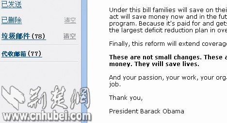 荊楚網(wǎng)消息 (楚天都市報)(記者蔡青)華中科大新聞碩士楊志為一年前曾給奧巴馬的個人官方網(wǎng)站發(fā)出郵件,提出關(guān)于醫(yī)改的問題。沒想到上個月卻收到4封回函!捌渲杏袃煞庵苯邮鹈绹偨y(tǒng)奧巴馬,還有其視頻簽名!弊蛉,楊志為高興地告訴記者。