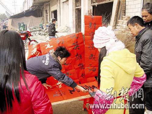昨日上午,成家良開始擺攤賣春聯(lián),不一會(huì)兒就引來了不少圍觀的人。一名小伙子花了10元錢買下一副火星文春聯(lián),他說,成家良賣的是非主流春聯(lián),夠創(chuàng)意,但“不知道家里人能不能接受”。也有圍觀的老人不贊同成家良的創(chuàng)意:“他對(duì)書法的精髓還沒有完全掌握好,就想著去創(chuàng)新,未免太心急了!