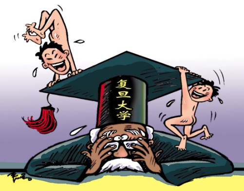 日前,兩名畢業(yè)在即的復(fù)旦男生,頭戴學(xué)士帽在校園內(nèi)裸奔慶祝畢業(yè),并拍照留念。 (昨日《羊城晚報》)