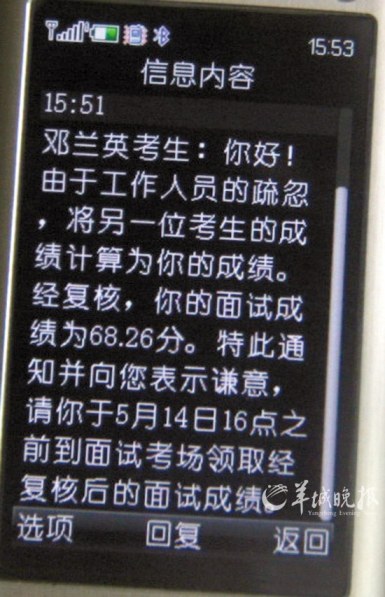 該負(fù)責(zé)人稱,得知此情況,他馬上叫一名姓蘇的工作人員電話告知鄧蘭英,告訴她剛才所發(fā)的成績(jī)通知書(shū)中,成績(jī)有誤,要求她返回考場(chǎng)更正。鄧聽(tīng)后說(shuō),她已坐車(chē)在返回到徐聞的路上,該局人員于是承諾可支付其交通費(fèi),叫她速返回考場(chǎng)。但鄧不同意,最后,工作人員只好用手機(jī)13413633948(記者注:考場(chǎng)工作值班用的電話)發(fā)給鄧短信,對(duì)搞錯(cuò)其成績(jī)一事表示抱歉并吩咐她于5月14日下午4時(shí)前到面試考場(chǎng)取經(jīng)復(fù)核后的面試成績(jī)(注:鄧收到短信時(shí)間是5月12日16時(shí)47分)。