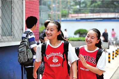 姐妹倆都是中關(guān)村中學(xué)的學(xué)生,姐姐叫王裔文,妹妹叫王裔靜。昨天姐妹倆一起出現(xiàn)在北大附中門口,接送的父母遠(yuǎn)遠(yuǎn)離開。和其他女生不一樣,姐妹倆走起路來虎虎生風(fēng),有點(diǎn)假小子的英氣。對(duì)于頻頻參加重大比賽的姐妹倆來說,似乎更能適應(yīng)高考的壓力。她們?cè)谛iT口興奮地和老師、同學(xué)們擊掌打氣,王裔文的班主任開玩笑地后退一步:“你的掌力那么大,我可吃不消!