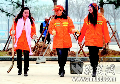 昨天中午,記者在武漢火車站東廣場(chǎng)看到,有三名年輕、漂亮的女孩,穿著橘紅色的環(huán)衛(wèi)工作服,和同事們一起作業(yè)。據(jù)介紹,這三名女孩都是“85后”的大學(xué)畢業(yè)生,于2009年12月25日前后應(yīng)聘上崗的,她們的名字分別是付莎莎(江漢大學(xué)衛(wèi)生技術(shù)學(xué)院畢業(yè))、羅瑛(長(zhǎng)江職業(yè)學(xué)院畢業(yè))、付琴菲(湖北藝術(shù)職業(yè)學(xué)院畢業(yè))。