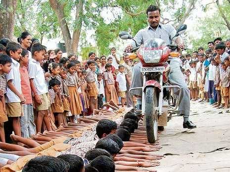 據(jù)德國(guó)《圖片報(bào)》7月29日消息,如圖所示,一群印度孩子平躺在地上,將自己的手臂向前伸。一名男子騎著摩托車從他們的手上軋過去……