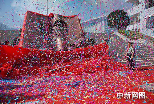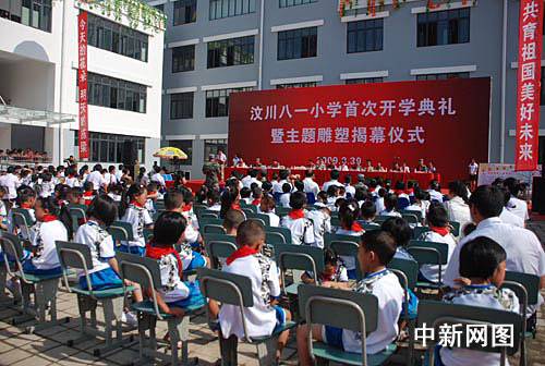 中新網(wǎng)汶川8月30日電(鐘美蘭)紅旗招展,彩帶飄飄。30日,由第二炮兵對(duì)口支援,在廢墟原址上建設(shè)汶川八一小學(xué)開學(xué),學(xué)校舉行了隆重的開學(xué)典禮。