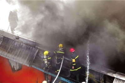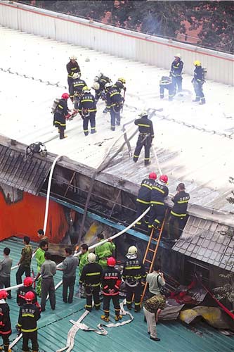 采石路消防中隊(duì)和首體南路消防中隊(duì)出動(dòng)10輛消防車相繼趕到,消防員向屋頂噴水后,攀上樓頂鑿開屋頂彩鋼板向內(nèi)噴水。很快,明火被撲滅。消防員需一人指引進(jìn)入教室,小石便自告奮勇領(lǐng)路。小石說:“教室有一個(gè)籃球場大,里面有音響設(shè)備和椅子等物,當(dāng)時(shí)屋內(nèi)濃煙滾滾!彼S即撤出,消防員繼續(xù)進(jìn)行撲救。