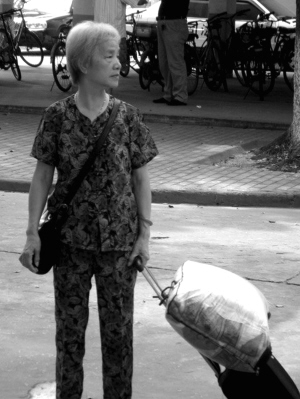 爺爺輩的送新族——一位頭發(fā)花白的老者騎著一輛電動(dòng)車,車后綁滿了大大小小的包裹、箱子。一個(gè)女孩皺著眉頭對(duì)老者抱怨著什么。原來,女孩因?yàn)楦改笡]能陪同前來非常生氣,她向老人埋怨說,別人都有父母代辦手續(xù),而自己必須獨(dú)自排隊(duì)繳費(fèi)。老人的銀發(fā)在風(fēng)中顯得零亂,額頭上滲出的汗珠在秋日的陽光里閃閃發(fā)亮。