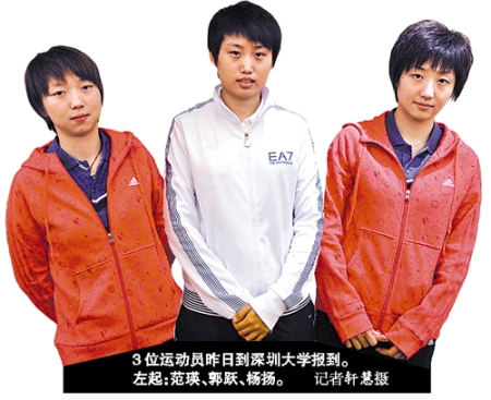 本報訊(記者張瑩 通訊員邱妙芳)昨天晚上,郭躍、范瑛和楊揚三位運動員從深圳大學校長章必功手中接過深大頒發(fā)的學生證。