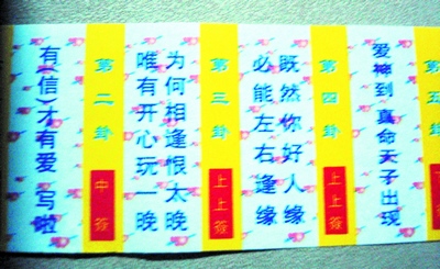記者打開“求簽筒”,看到所謂“簽文”上寫有“恭喜,恭喜,你終于有喜”等內(nèi)容。記者仔細(xì)看了一下,竟發(fā)現(xiàn)“簽文”中有不少錯別字。