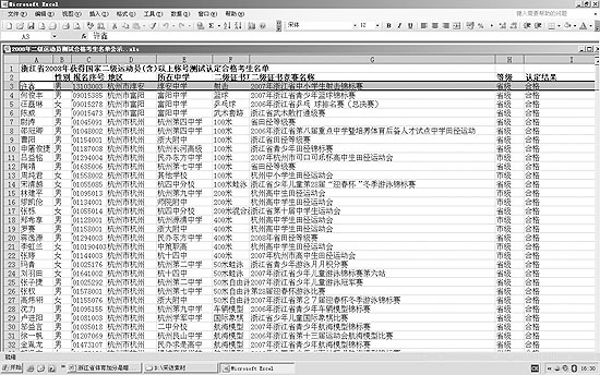 打開這個公示名單,前兩行的內容分別是:“許鑫;性別:男;報名序號:13103003;地區(qū):杭州市淳安;所在中學:淳安中學;二級證書:射擊;二級證書競賽名稱:2007年浙江省中小學生射擊錦標賽;等級:省級;認定結果:合格”。