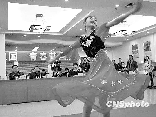 8時(shí)10分,面試開始,第一個(gè)上場的陳曉琴做了簡單的自我介紹,大屏幕顯示她抽中的問題是:如何能做一個(gè)合格的軍人。陳曉琴說,要做一名合格的軍人不但要嚴(yán)明紀(jì)律、聽從指揮,還要團(tuán)結(jié)同志。接著她表演了跆拳道,并拿下了北京市女兵面試的第一個(gè)分?jǐn)?shù)——26分,全部考試,陳曉琴用了8分鐘。 8時(shí)50分,來自民族大學(xué)舞蹈學(xué)院的5號應(yīng)試者朱瑜上場了。回答了相關(guān)的問題后,她拿出了一把藍(lán)色的綢扇,跳起了一套她自編的舞蹈,婀娜的舞姿征服了全場的觀眾,也征服了9位評委,她得了28.57的高分,這個(gè)分?jǐn)?shù)也是海淀考區(qū)全天考試的最高分。與她同樣得了最高分的還有清華大學(xué)的王曉麗。
