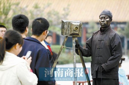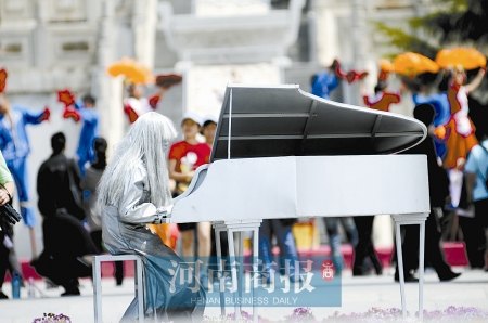 河南開封翰園里游客如織。喧囂的人群中,一尊雕塑寂靜地立在花壇之上,文靜的少女端坐琴前,專注的表情仿若與世隔絕。只有白天的每個整點(diǎn)時刻,游客才會發(fā)現(xiàn)這些雕塑“活著”。