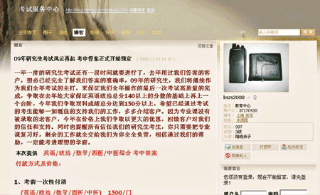 據(jù)“傳播小王子”反映,這些販賣試題的廣告不僅在各大考研論壇上蔓延,而且在QQ群、百度貼吧等處也是層出不窮,甚至有人開博客公然叫賣。而服務(wù)的種類從考前一天提供考試答案到考場中“在線服務(wù)”不一而足。