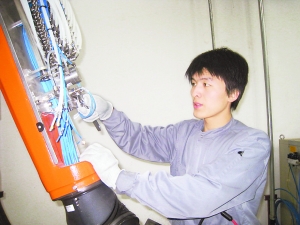 車(chē)間的流水線突然發(fā)出報(bào)警,機(jī)器人隨之停止工作。4月10日上午10時(shí),楊雪峰正坐在中控室監(jiān)視流水線運(yùn)轉(zhuǎn),面前的紅燈閃個(gè)不停。他拎起工具包,和師傅跑到報(bào)警機(jī)器前。一個(gè)兩米多高的機(jī)器人“罷工”了!斑@個(gè)機(jī)器人是專(zhuān)給車(chē)身噴漆的,它一停,整個(gè)流水線就不能運(yùn)轉(zhuǎn)了!睏钛┓蹇刂谱⌒睦锏木o張,緊握扳手的右手有些微微顫抖,爬上流水線和師傅一起查找原因,“進(jìn)廠后就沒(méi)修過(guò)機(jī)器人這個(gè)大家伙,在師傅身后學(xué)了半年,這回終于派上用場(chǎng)了。”