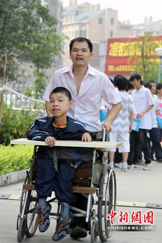 中新網(wǎng)宜昌6月20日電(記者 劉良偉 上官純青)20日,湖北宜昌7.7萬名學(xué)子參加了當(dāng)?shù)氐闹锌迹@其中有一位特殊的孩子——宜昌市十五中905班的王宇,在父親的陪伴下,來到當(dāng)?shù)貙iT設(shè)立的特殊考生考場(chǎng)參加了考試。十多年來,父親王忠(化名)為患有罕見的肌肉營養(yǎng)不良癥的王宇,和妻子沒有放棄,用人間真愛一路陪伴著兒子,無論風(fēng)吹雨淋,他都執(zhí)著地背孩子上學(xué),并自己鉆研醫(yī)學(xué),以身試藥,用真心真愛演繹著平凡人生里不朽的傳奇。