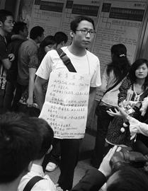 4月26日,一位身著淺藍色T恤、戴著黑邊眼鏡的男青年出現(xiàn)在成都市寧夏街人才市場門口。他的穿著打扮很普通,胸前掛的一塊“賣身求職”的牌子卻十分醒目,引來眾人圍觀。從這塊白紙紅字的牌子上可以得知,這名男子叫王志強,今年25歲,身高1.75米,大學文化。2005年他南下廣東,干過兩年管理工作。由于金融危機,企業(yè)倒閉,所以“現(xiàn)賣身求職,要求年薪至少10萬元!