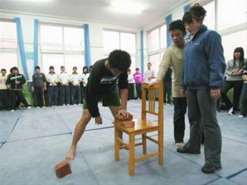 一名安全秘書專業(yè)的男生將一塊磚頭輕易打碎。 記者 徐剛 攝