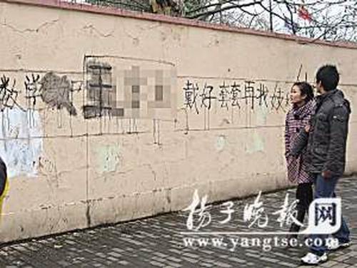 昨天是新學(xué)期的第一天。然而,離南京市第十二中學(xué)不到300米的一處圍墻上被人用墨水書寫惡毒的話語(yǔ),辱罵該校一名即將退休的數(shù)學(xué)老師,言語(yǔ)不堪入目。該校校長(zhǎng)得知消息后,立即帶人用石灰膏涂去了學(xué)校名字和老師的名字,然后報(bào)了警。目前,警方已經(jīng)介入調(diào)查。