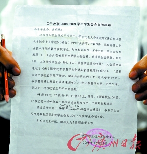記者從該學校學生會2008年12月15日下發(fā)的一份蓋有公章的《關于收取2008~2009學年學生會會費的通知》上看到,收取會費的根據(jù)是佛山職業(yè)技術學院第三次學生代表大會通過的《佛山職業(yè)技術學院學生會章程》(修改)中的有關內容,“凡取得佛山職業(yè)技術學院學籍的在校學生,均為本會會員”、“學生會經(jīng)費來源,會員在校期間交納學生會會費(每人每年20 元),由系學生會收繳,留用70%,上繳學院學生會30%!