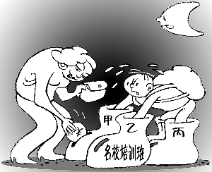 “這幾年為孩子報(bào)各種班可沒(méi)少花錢(qián)!备窀駤尨炙懔艘幌,僅在“巨人”的英語(yǔ)班從去年暑假到今年寒假就花了8000多元,加上“學(xué)而思”的奧數(shù)班,還有目標(biāo)校的“占坑”班,這兩年加起來(lái)花了25000多元。目標(biāo)校培訓(xùn)班,一個(gè)學(xué)期1000多元,一年就是2000多元,每個(gè)班30多個(gè)孩子,13個(gè)班左右,目標(biāo)校的培訓(xùn)班一年就能收78萬(wàn)元,民間機(jī)構(gòu)辦的班、收的費(fèi)就更多了。