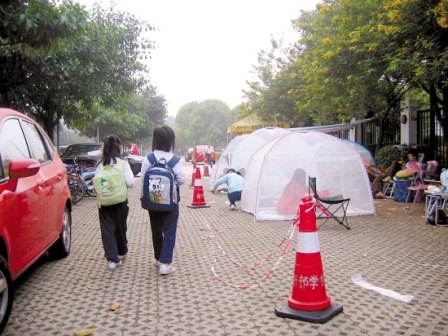 昨晚,記者來到祈福新村學校門口,昏黃的燈光下,疲憊不堪的家長們坐在躺椅上閑聊,有的干脆鉆到自帶的蒙古包帳篷里睡覺。現(xiàn)場到處彌漫蚊香和驅(qū)蚊水味道。