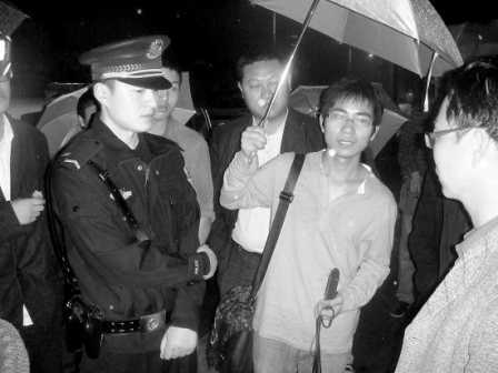 “下午2點(diǎn)20分左右,距比賽開始僅僅剩下40分鐘了,賽場(chǎng)內(nèi)前奏的音樂已經(jīng)響起,這時(shí)‘米黃外套’回來終于告訴大家,由于此次用的是賽車場(chǎng)發(fā)給上海市中學(xué)生的團(tuán)體票,大學(xué)生不能入場(chǎng),所以今天可能‘沒戲了’。此時(shí)九陽旅行社的洪經(jīng)理看起來也焦頭爛額,他沒有打傘,站在大雨里,水珠不斷順著頭發(fā)流下!