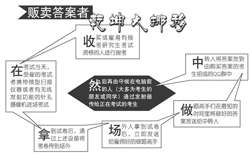 首先,雇用有報考研究生考試資格的人進(jìn)行報考,在考試當(dāng)天,受雇者攜帶微型掃描儀器或有無線發(fā)射功能的針孔攝像機(jī)進(jìn)入考場考試,拿到試卷后,通過上述設(shè)備將考卷傳到場外,場外人拿到試卷后,立即發(fā)送給雇用好的做題高手,做題高手在最短的時間里將做好的答案發(fā)送給中轉(zhuǎn)人,中轉(zhuǎn)人再將答案發(fā)到由購買答案的考生組成的QQ群中,然后再由守候在電腦前的人(大多為考生的朋友或同學(xué))通過發(fā)射器傳給正在考試的考生。