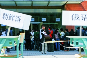 二外今年8個(gè)小語種專業(yè)計(jì)劃招收102人,昨日?qǐng)?bào)名現(xiàn)場吸引來2300余名家長和學(xué)生,F(xiàn)場,一位家長拿著計(jì)算器核算一番后,決定替孩子報(bào)考朝鮮語,“這個(gè)專業(yè)報(bào)考的人少,分?jǐn)?shù)自然不會(huì)太高。”