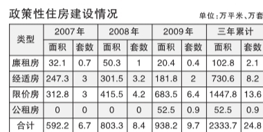 在住房保障方面,自2007年至2009年,本市已累計建設了24.8萬套政策性住房。其中限價房套數(shù)最多,達到13.6萬套。
