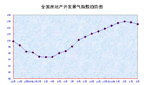 中新網(wǎng)6月10日電 據(jù)國家統(tǒng)計局網(wǎng)站消息,5月份,全國房地產(chǎn)開發(fā)景氣指數(shù)(簡稱“國房景氣指數(shù)”)為105.07,比4月份回落0.59點,比去年同期提高9.13點。