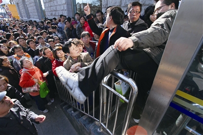 8時40分許,現場已聚集了上千人,民警和保安趕來維持秩序,工作人員正在商討如何讓大家安全地進入大廳,以免發(fā)生踩踏。