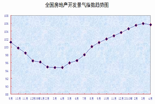 中新網(wǎng)5月11日電 據(jù)統(tǒng)計(jì)局網(wǎng)站消息,4月份,全國(guó)房地產(chǎn)開(kāi)發(fā)景氣指數(shù)(簡(jiǎn)稱“國(guó)房景氣指數(shù)”)為105.66,比3月份回落0.23點(diǎn),比去年同期提高10.90點(diǎn)。