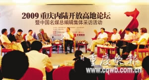 昨日,“2009內(nèi)陸開發(fā)高地論壇”在我市舉行,國(guó)內(nèi)十家知名媒體的總編輯應(yīng)邀到會(huì),他們包括了南方周末總編輯向熹、第一財(cái)經(jīng)日?qǐng)?bào)總編輯秦朔、21世紀(jì)經(jīng)濟(jì)報(bào)道總編輯劉洲偉、中國(guó)新聞社社長(zhǎng)劉北憲、新浪網(wǎng)總編陳彤、中國(guó)周刊執(zhí)行社長(zhǎng)朱德付、新京報(bào)總編輯戴自更、新聞出版報(bào)社長(zhǎng)姜軍等。老總們集體采訪了市委常委、常務(wù)副市長(zhǎng)黃奇帆,請(qǐng)他闡釋“重慶怎樣才算建成內(nèi)陸開放高地”,黃奇帆回答說:“我個(gè)人認(rèn)為,將來重慶成了長(zhǎng)江上游的經(jīng)濟(jì)中心、金融中心和貿(mào)易中心,內(nèi)陸開放高地就算建成了!