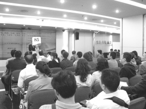 拍賣師萬華介紹,今年拍賣會(huì)的火熱與去年的冷清場面形成鮮明對(duì)比。在去年樓市低迷時(shí)期,拍賣現(xiàn)場常常只零散地坐著10多個(gè)競買人,經(jīng)常有房產(chǎn)因參與競拍人數(shù)不足兩人而流拍,只有進(jìn)行多次調(diào)價(jià)多次拍賣,還有許多房產(chǎn)無人競價(jià)而以底價(jià)成交,即使有人競買也是寥寥數(shù)人。到拍賣后半場,由于有人提前離場,稀稀拉拉的幾個(gè)人,也再?zèng)]舉牌熱情。