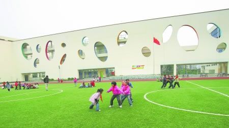 昨日下午,記者來到草堂小學(xué)翠微校區(qū),4棟通過走廊連為一體的4~5層的建筑格外引人注目。正對(duì)學(xué)校大門的墻體,鑲著10多個(gè)彩色的橢圓。設(shè)計(jì)者、西南交通大學(xué)教授王蔚介紹說,翠微校區(qū)占地20余畝,建筑面積一萬余平方米,而總投資僅2000多萬元。“這些彩色的橢圓圖案,代表著水滴。陽光下,‘水滴’呈現(xiàn)出不同顏色,這代表了學(xué)生們的不同個(gè)性。校舍以‘陽光下的水滴’為設(shè)計(jì)構(gòu)思,充分表達(dá)了在我國(guó)素質(zhì)教育的原則下,尊重個(gè)性發(fā)展,尊重少年兒童人格特征的理念。”