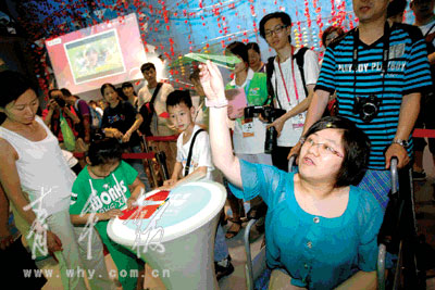 昨天上午,在世博局相關(guān)工作人員的安排下,不需要排隊,通過媒體工作人員專用通道,小邢怡第一時間入了園。8點(diǎn)50分,邢怡來到了向往已久的中國館門前,早已等候著的中國館副館長龔惠斌迎了上來,熱烈歡迎小邢怡來中國館,龔惠斌副館長還送了小邢怡一份小禮物,精致的世博徽章,還有介紹中國館的精美圖冊。小邢怡傻傻地笑著說不出話,咧著嘴開始了奇妙的中國館之旅。后來小邢怡悄悄告訴記者,一直看新聞上說中國館預(yù)約券有多么的難得,參觀中國館有多么的不容易,她根本沒想到自己能那么幸運(yùn),所以剛進(jìn)中國館的那會兒,感覺像做夢一樣。