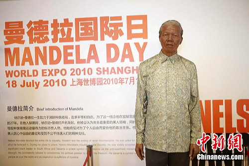 當(dāng)天,一尊來自上海杜莎夫人蠟像館的曼德拉蠟像“走入”南非館,栩栩如生的造型讓有人覺得仿佛這位“人權(quán)斗士”真的親臨世博園,游客紛紛掏出相機(jī)、駐足與偉人留影。